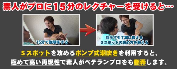 Sスポットの攻め方がわかる「ポンプ式潮吹きテクニック」をマスターすると、女性が本気で感じ始め、いくら拒んでも確実に潮を吹かせることが出来るようになります。