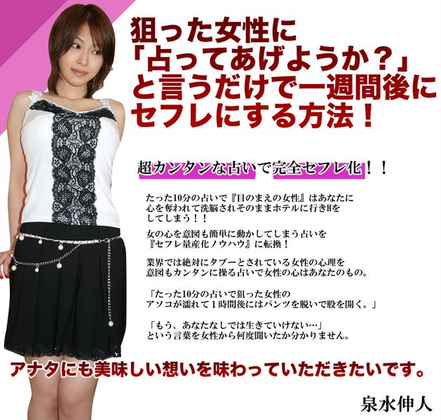 当サイト経由で「狙った女性に「占ってあげようか?」と言うだけで一週間後にセフレにする方法!」をご購入頂くと、