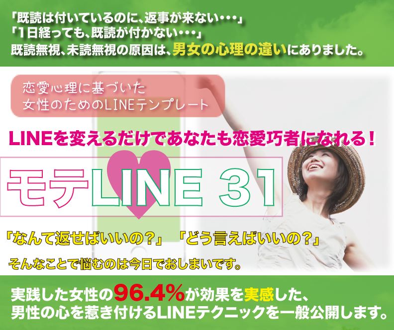 当サイト経由で「モテLINE31 恋愛心理に基づいた、女性のためのLINEテンプレート」をご購入頂くと、