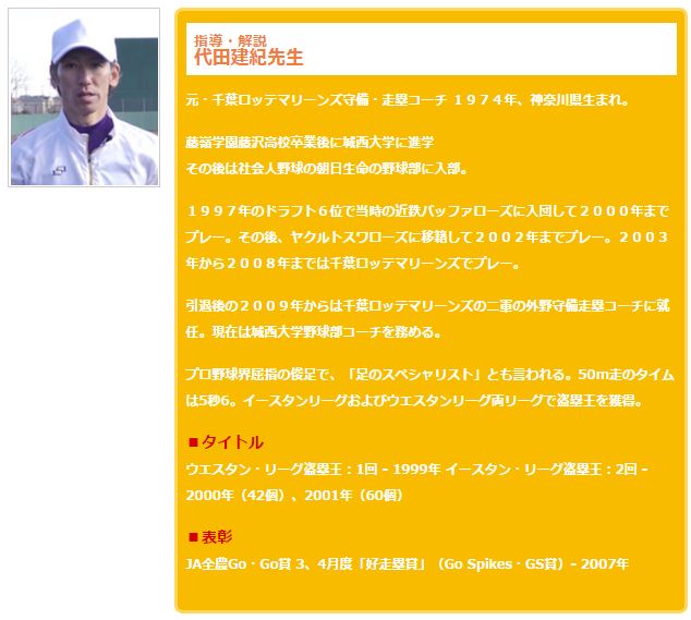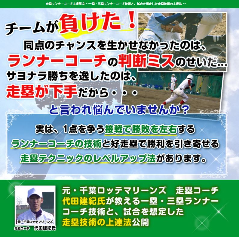 「走塁ランナーコーチ上達革命」では、元・千葉ロッテマリーンズ守備・走塁コーチの代田建紀氏がランナーコーチと走塁のスキルを効率良くアップさせるためのトレーニングの極意を公開しています。