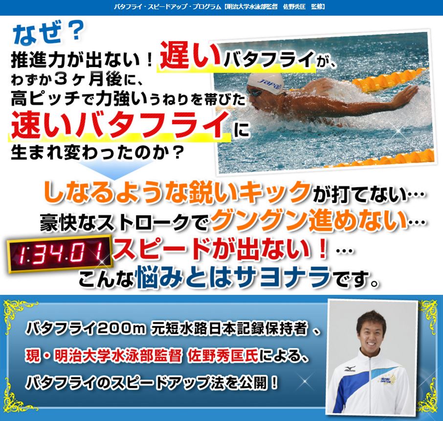 この上達プログラムは、佐野秀匡コーチが長年の選手経験を生かして培ってきた、バタフライを最短時間でスピードアップさせるための方法をDVD教材としてご提供するものです。